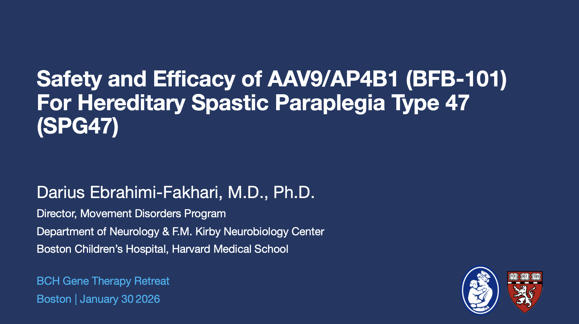 Updates on the Phase 1/2 Clinical Trial: Safety and Efficacy of AAV9/AP4B1 (BFB-101) For Patients With AP4B1-related Hereditary Spastic Paraplegia Type 47 (SPG47) [NCT06948019] at 1st Boston Children’s Hospital Gene Therapy Retreat Posted on February 1, 2026 by Darius Ebrahimi-Fakhari